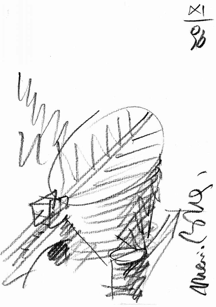 Schizzo a matita dell'Arch. Mario Botta, November 1996: La chiesa di Mogno. Sotto: Schizzo per le acquasantiere.